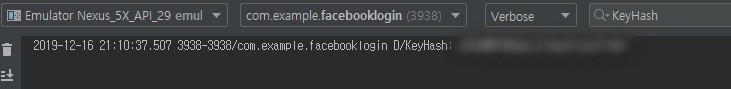 Logcat에 KeyHash로 필터로 뜨는 값을 확인하면 해시키(Hash key)를 가져올 수 있습니다.
