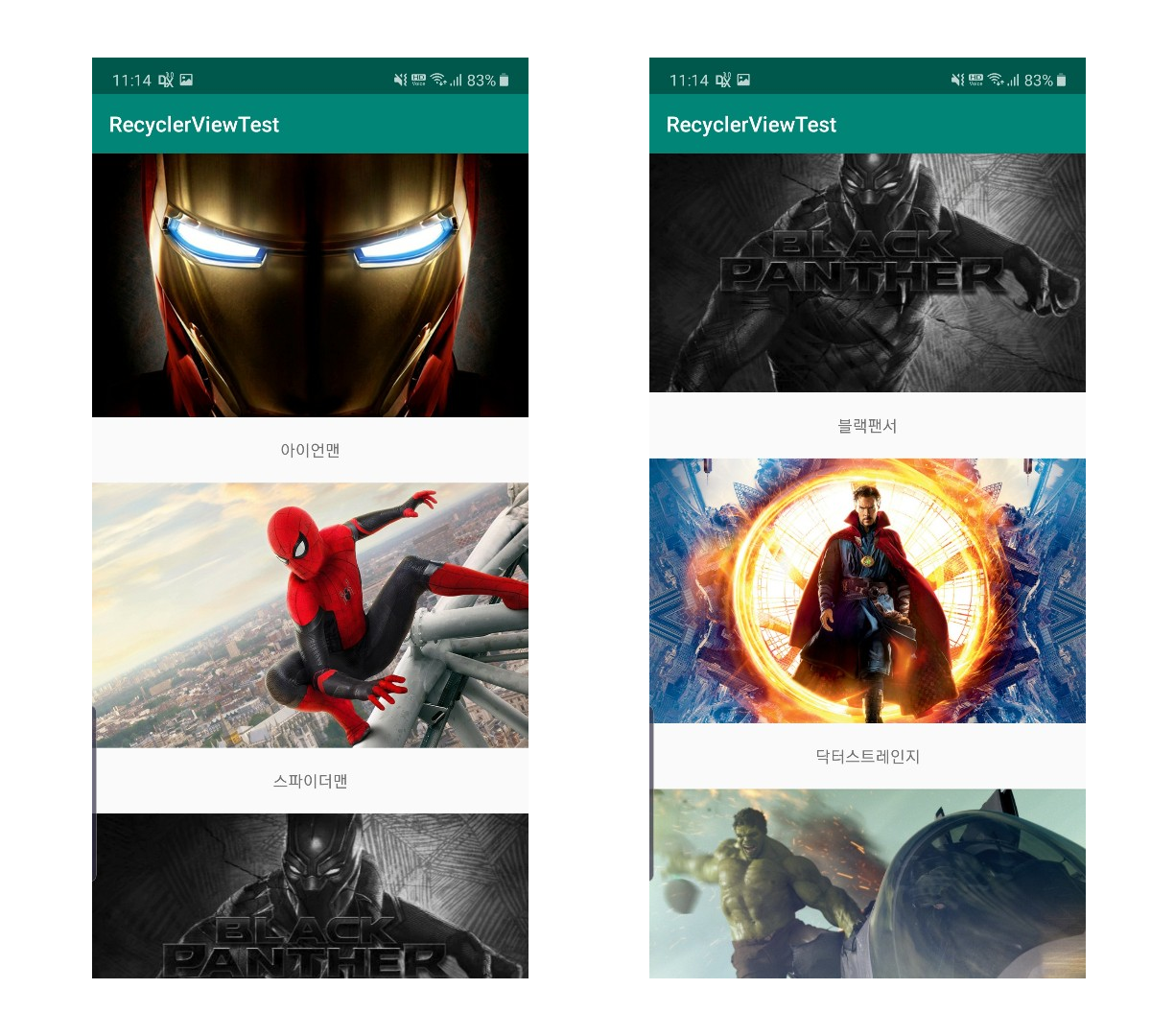 RecyclerView의 기본적인 사용방법에 대해 알아보았습니다. 처음에는 ListView보다 복잡하고 사용하기 어려울지 몰라도 성능이나 커스터마이징면에서는 확실히 리사이클러뷰가 뛰어납니다.