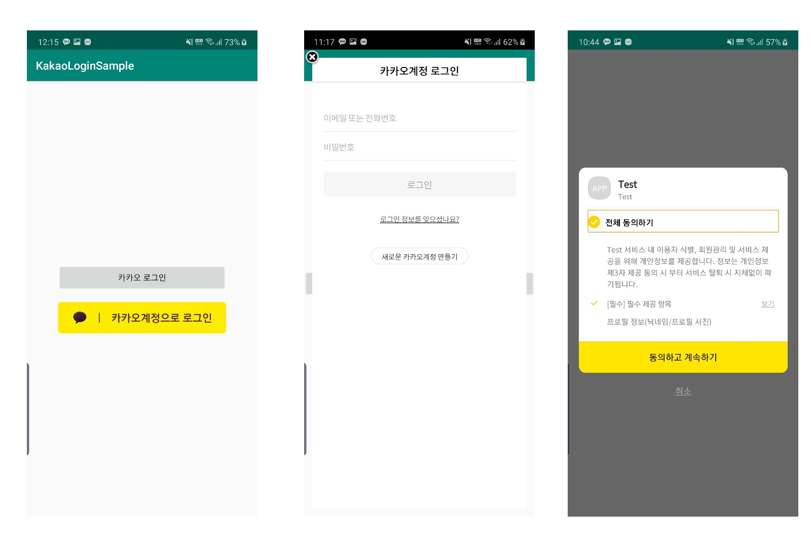 카카오에서 제공하는 카카오계정으로 로그인과 커스텀버튼으로 만든 카카오로그인의 기능은 같기 때문에 둘중 하나라도 누르면 카카오 로그인 창이 띄워집니다. 로그인에 성공을 하게 되면 Logcat을 확인하여 계정에 대한 카카오 정보를 가져올 수 있습니다.