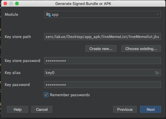 5. 처음 들어왔던 창에 값이 입력이 된 상태로 나오게 됩니다. Rememver passwords는 다음에 해당 프로젝트를 다시 APK파일로 추출을 하할 때 필요합니다. 비밀번호를 다시 치기가 귀찮다 싶으면 체크를 해주시고, 보안에 문제가 되 불안하다 싶으면 해제해주시면 됩니다. Next버튼을 눌러줍니다.