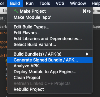 1. 상단 메뉴바를 보면 Build를 클릭하면 다음그림과 같이 나옵니다. Generate Signed Bundle / APK... 을 클릭해줍니다.