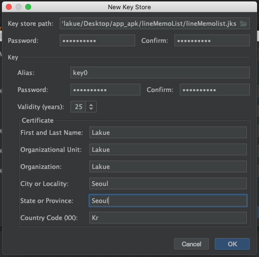 4. 여기서 키스토어 경로를 설정해주고, 그 외 값들을 입력해줍니다.