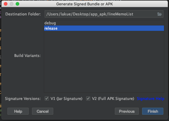 6. Destination Folder에 APK파일을 받을 경로를 선택해주고, Build Variants에는 release를 선택해줍니다.