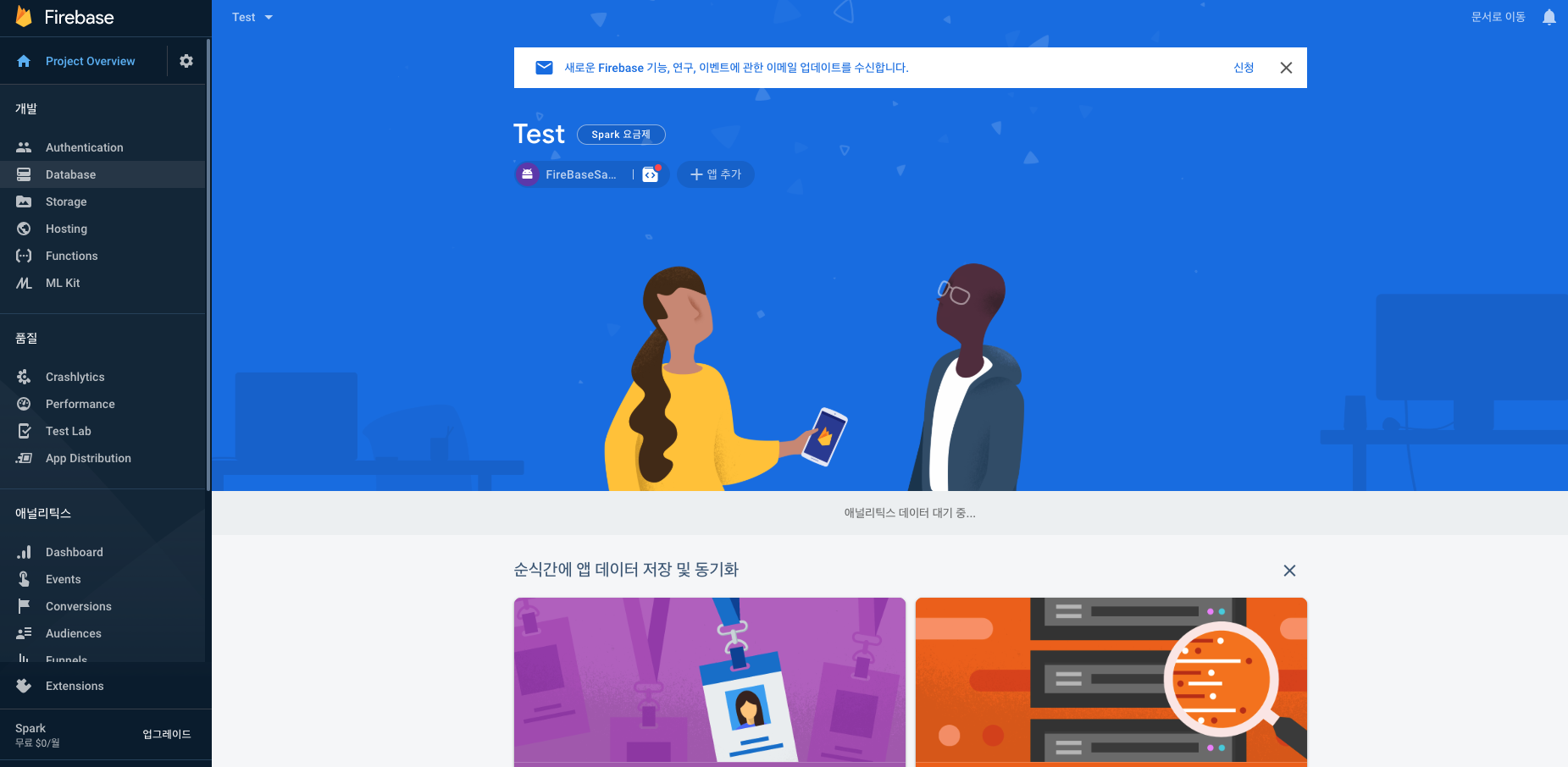현재 상태는 파이어베이스와 안드로이드 스튜디오를 연결했을 뿐이지, 아직 데이터베이스를 만들지는 않았습니다.