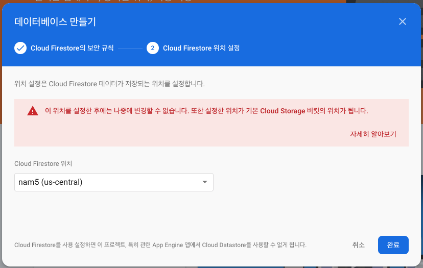 파이어베이스 클라우드의 위치를 설정해주고 완료버튼을 눌러주세요.