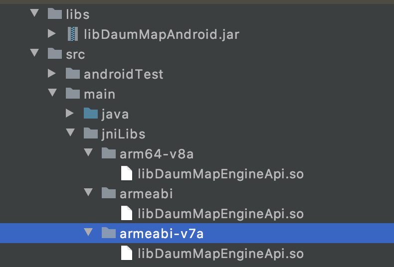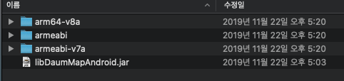 libDaumMapAndroid.jar파일과 아키텍쳐별로 libMapEnginApi.so파일로 구성되어 있습니다.
