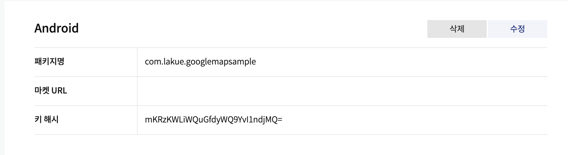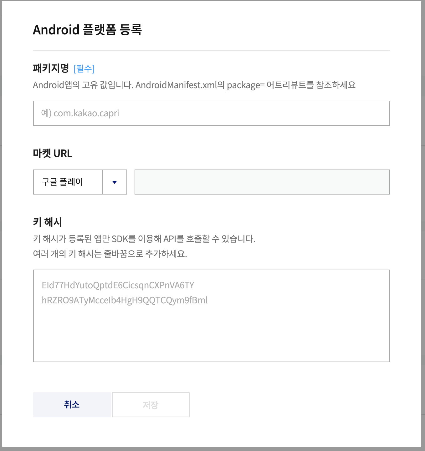 패키지명을 입력해주고, 마켓 URL은 없으면 없음을 선택해주시면 됩니다.