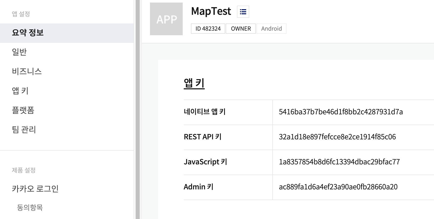 요약정보에 가시면 다양한 앱 키에 대해서 나옵니다. 저희는 안드로이드니까 네이티브 앱 키를 사용할 예정입니다.
