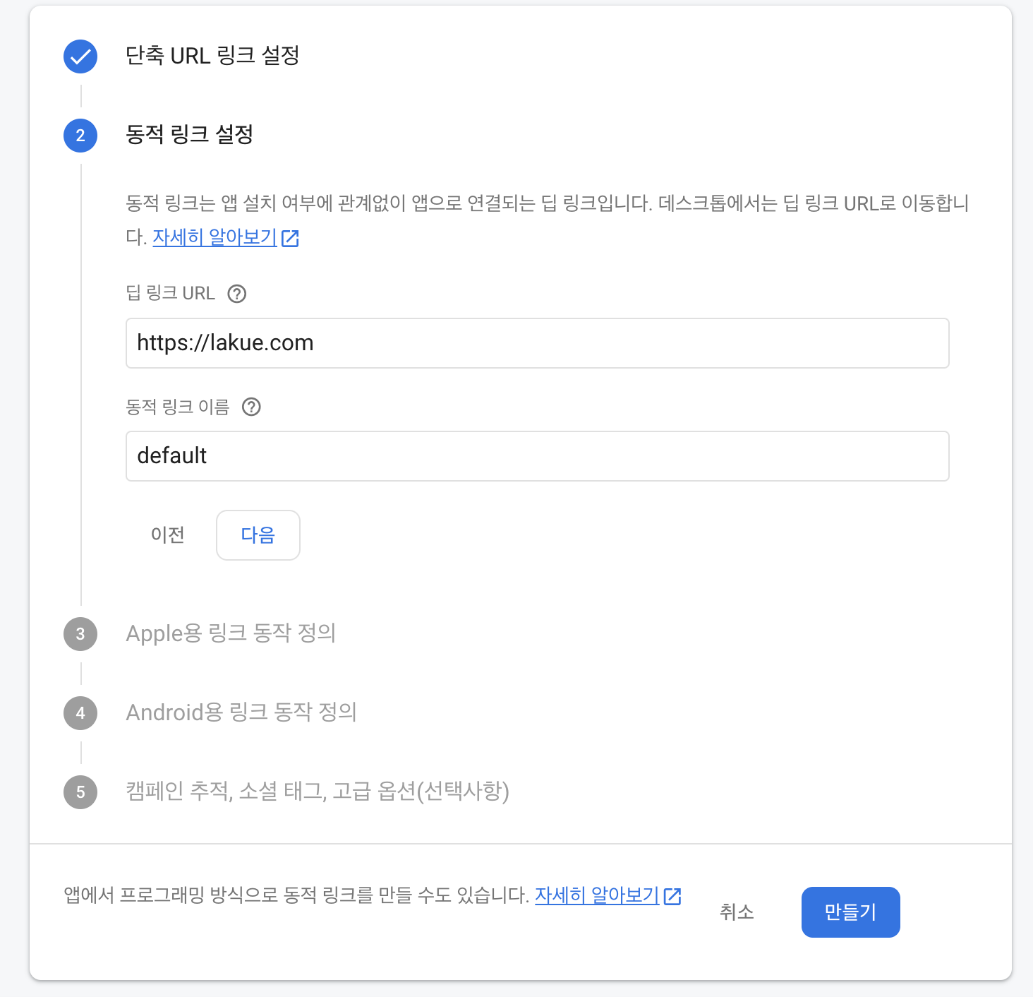 딥링크 URL을 설정하고, 동적 링크 이름을 설정해줍니다.