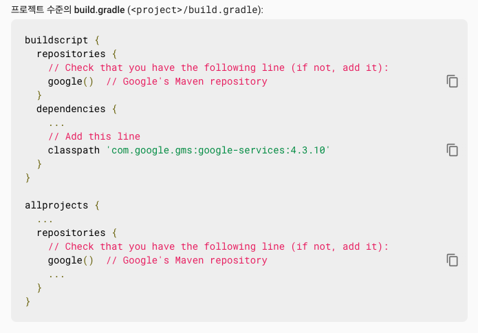 google-services.json파일을 다운로드 받으신 후 복사하여 프로젝트 app 하위 항목에 넣어줍니다.