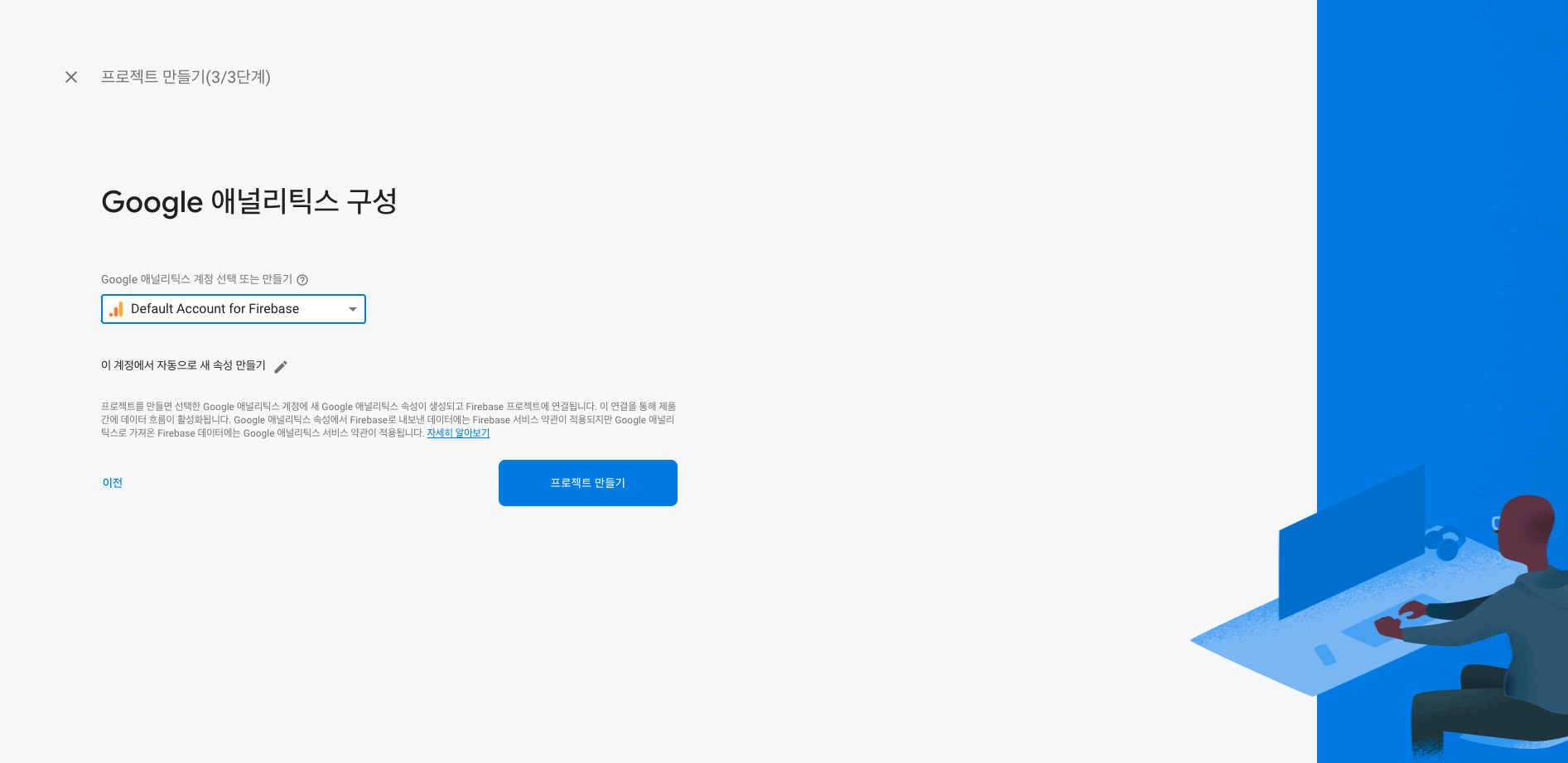 '이 프로젝트에서 Google 애널리틱스 사용 설정' 기능은 구글이 제공하는 웹 애널리틱스 서비스로, 마케팅을 할 때 사용이됩니다. 저는 체크을 해두는건 권장합니다.