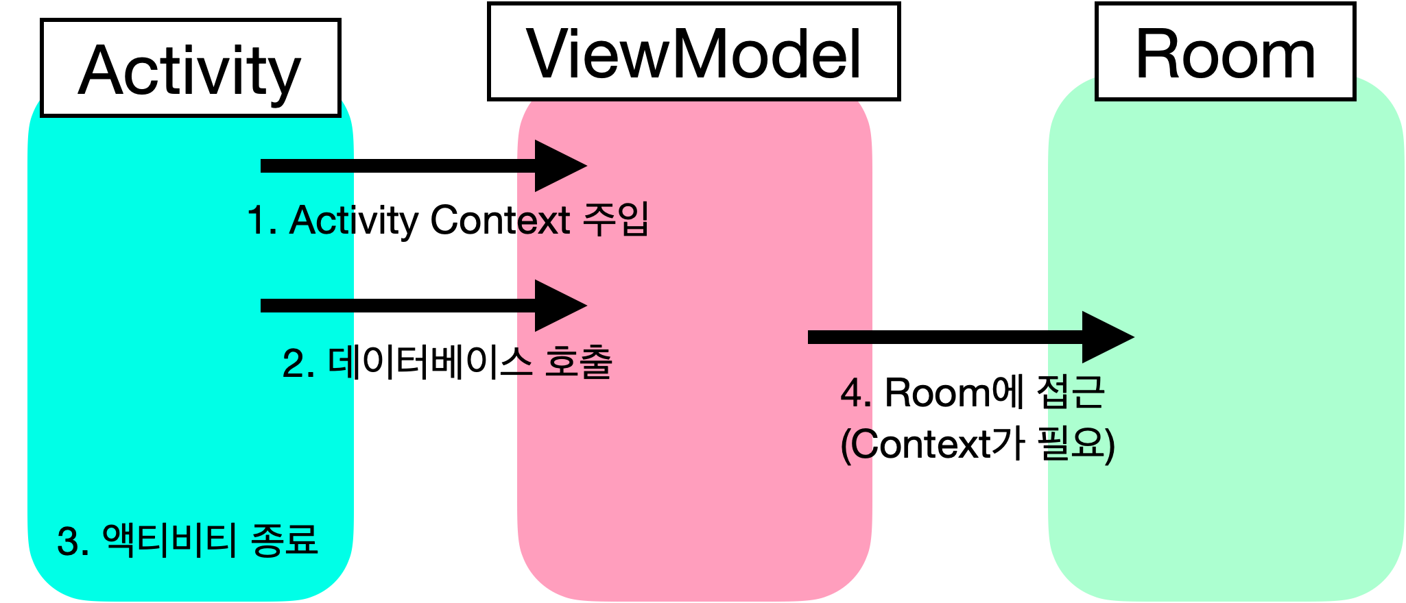 Room에 접근하기 위해서는 Context객체가 필요한데 보시다시피 ViewModel에서 참조하고 있는 ActivityContext가 Activity가 종료가 되면서 메모리 누수 현상이 발생하게 됩니다. 이러면서 앱은 강제 종료가 되며 사용자는 불편을 겪게 됩니다.